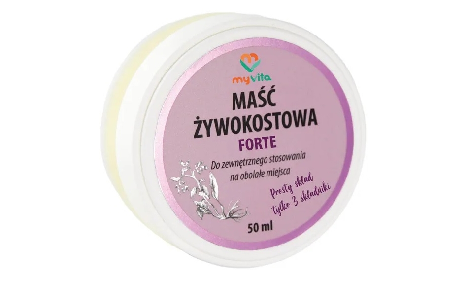 Macerat żywokostu lekarskiego, wazelina farmaceutyczna i wosk pszczeli w maści marki MyVita tworzą silnie rozgrzewającą maść, która może być stosowana na stłuczenia i obrzęki. Maść żywokostowa w korzystny sposób wpływa również na naturalne procesy regeneracyjne naskórka. Dodatkowo żywokost ściąga skórę i wykazuje działanie przeciwzmarszczkowe i ściągające. Małe opakowanie maści żywokostowej MyVita zawiera 50 ml formuły o prostym wkładzie do stosowania w celu łagodzenia odczuwania bólu różnego pochodzenia.