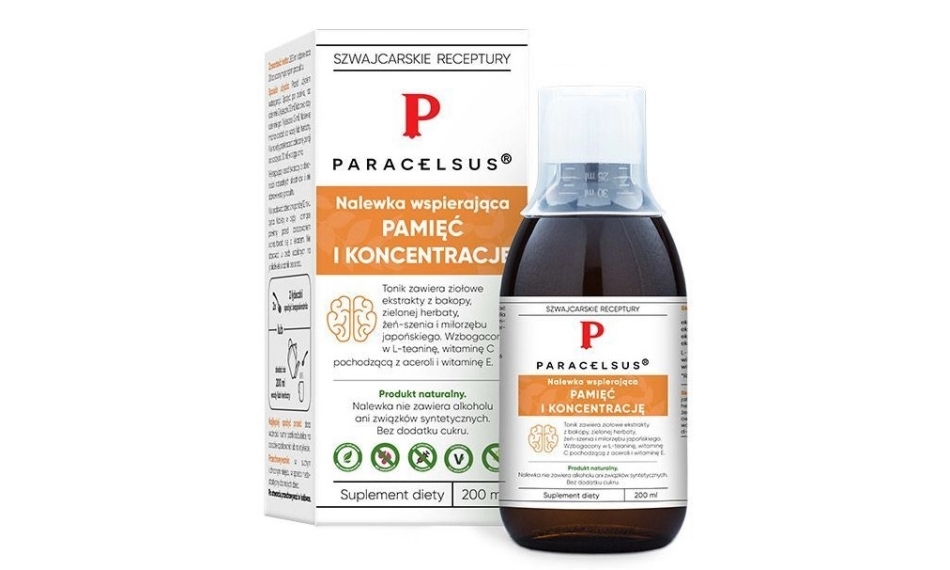 Paracelsus, Pamięć i Koncentracja to suplement diety w płynie zawierający ziołowe ekstrakty z zielonej herbaty, bakopy drobnolistnej, żeń-szenia koreańskiego, miłorzębu japońskiego oraz witaminę C pochodzącą z aceroli i markową witaminę E (Quali®-E). Bez dodatku cukru - zawiera naturalnie występujące cukry. Preparat nie zawiera alkoholu w 100% odpowiedni dla wegan