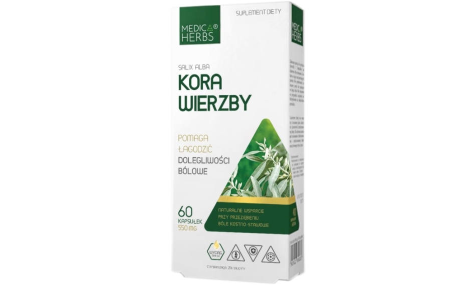 Wyciąg z kory wierzby Medica Herbs zawiera 23% salicyny znanej z tego, że wspiera stan naturalnego odprężenia i wyciszenia, dodatkowo pomaga utrzymać właściwą odporność. Kora wierzby jest popularna ze względu na swoje właściwości, które pomagają w utrzymaniu równowagi w obliczu reakcji bólowych organizmu. Salicyna jest często porównywana do kwasu acetylosalicylowego (aspiryny), co sprawia, że jest często stosowana jako naturalny środek przeciwbólowy. Kora wierzby od wieków używana jest w medycynie naturalnej, szczególnie jako środek łagodzący ból i wspomagający w budowaniu odporności.