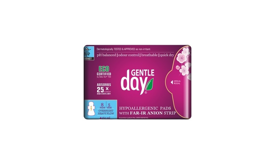 Najwyższej jakości Gentle Day® podpaski z paskiem anionowym: do produkcji nie używa się materiałów szkodliwych i alergizujących, są całkowicie wolne od chloru, środków zapachowych i chemikaliów, które mogą powodować podrażnienia skóry. pH przyjazne dla skóry. Wkładki Gentle Day® są ekologiczne. Zapewniają uczucie świeżości i komfortu. Górna warstwa podpaski – z włókna nietkanego, posiada dziurki w formie lejka, przez które ciecz szybko przedostaje się do wnętrza wkładki, nie wycieka i pozostawia suchą powierzchnię. Absorbujący polimer wchłania około 150 ml cieczy (ok. 5 razy więcej niż zwykłe podpaski), przepuszcza powietrze, zapewnia skórze oddychanie. Sterylne, unikalne opakowanie oraz pakowanie wkładek w oddzielne saszetki chroni przed wilgocią i mikroorganizmami.