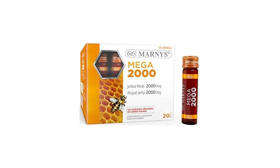 MARNYS® Mega 2000 to suplement diety zawierający 2000 mg czystego mleczka pszczelego (Royal Jelly) i witaminę C, w wygodnych fiokach do picia.