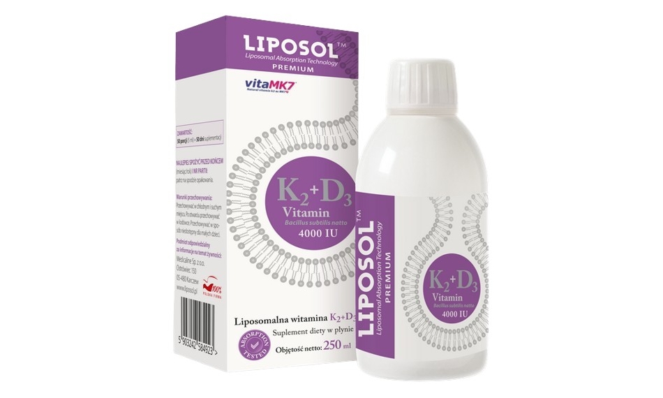 Liposomalna naturalna witamina K z fermentacji bakterii Bacillus Subtillis Natto + Witamina D3 4000 IU 250 ml zostały zamknięte w liposomach. Liposomy są małymi cząsteczkami (kuleczkami) lipidowymi, które powstają naturalnie w momencie kontaktu wody z lecytyną, składnikiem soi niemodyfikowanej genetycznie. Liposomy są łatwo wchłaniane przez organizm. Gdy witamina K rozpuszcza się w wodzie i miesza z lecytyną zachodzi proces enkapsulacji liposomalnej. Rezultatem jest lepsze wchłanianie witaminy K we krwi i bezpośrednio do ścian komórkowych.