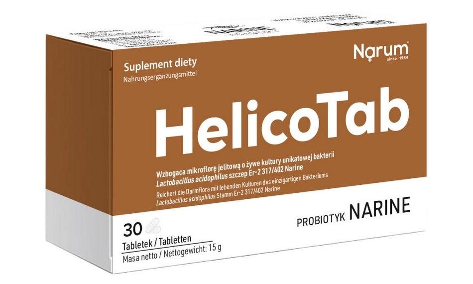 HelicoTab w tabletkach ma na celu uzupełnienie mikroflory jelitowej w bakterie Lactobacillus acidophilus szczep Er-2 317/402 Narine, metabolity bakterii Lactobacillus acidophilus szczep Er-2 317/402 Narine oraz metabolity Lactobacterium mazuni szczep Karine 2. Suplement rekomendowany jest w trakcie i po antybiotykoterapii dla uzupełnienia mikrobioty jelitowej.