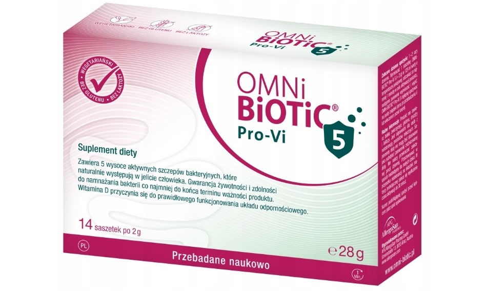 OMNi-BiOTiC® PRO Vi 5 – proszek to suplement diety pełniący funkcję probiotyku. Prace badawcze nad wpływem bakterii na infekcja wirusowe rozpoczął się dużo wcześniej niż temat stał się modny. Od 2014 roku zaczęto katalogować badania i wnioski o kluczowym wpływie mikrobiomu na odporność przeciwwirusową. OMNi-BiOTiC® PRO Vi 5 to połączenie kilku bardzo skutecznych szczepów bakterii w walce z wirusami górnych i dolnych dróg oddechowych, w tym najczęściej wywołującego hospitalizację u dzieci Syncytialnego wirusa oddechowego. Skuteczność także potwierdzona została przy rotawirusach wywołujących biegunki oraz objawy gastryczne przewodu pokarmowego u dzieci i dorosłych. Synergia zastosowanych szczepów stymuluje, wspiera bądź aktywuje aż 10 z 13 poznanych mechanizmów obronnych w walce z wirusami.