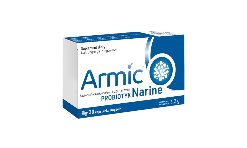 Armic to suplement diety w postaci kapsułek dla dorosłych oraz dzieci od 3. roku życia, który wspiera uzupełnienie mikroflory jelitowej w bakterie kwasu mlekowego Lactobacillus acidophilus Er-2 szczep 317/402 Narine.