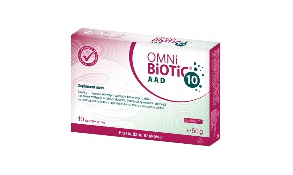 OMNi-BiOTiC 10 AAD zawiera 5 miliardów (=5 x 10 / porcja) bakterii jelitowych z 10 różnych szczepów w jednej porcji.