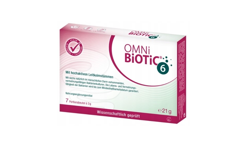 OMNi-BiOTiC® 6 – proszek w saszetce – zawiera 3 miliardy (=3 x 10^9 / porcja) bakterii jelitowych z 6 różnych szczepów w jednej porcji.