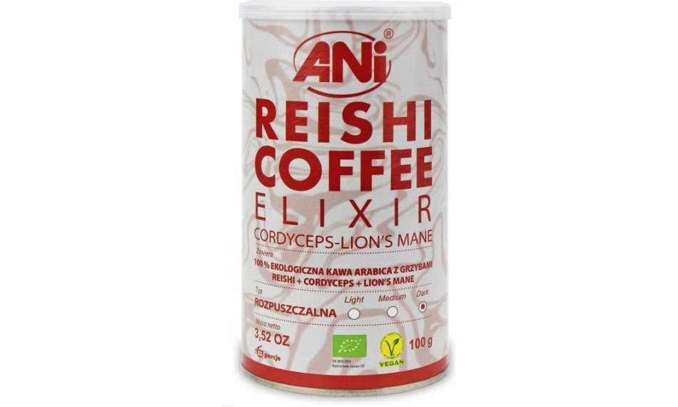 Suplement diety. Kawa arabica z ekstraktami z grzybów: lakownica lśniąca (Ganoderma lucidum), soplówka jeżowata (Hericium erinaceus), maczużnik chiński (Cordyceps sinensis).