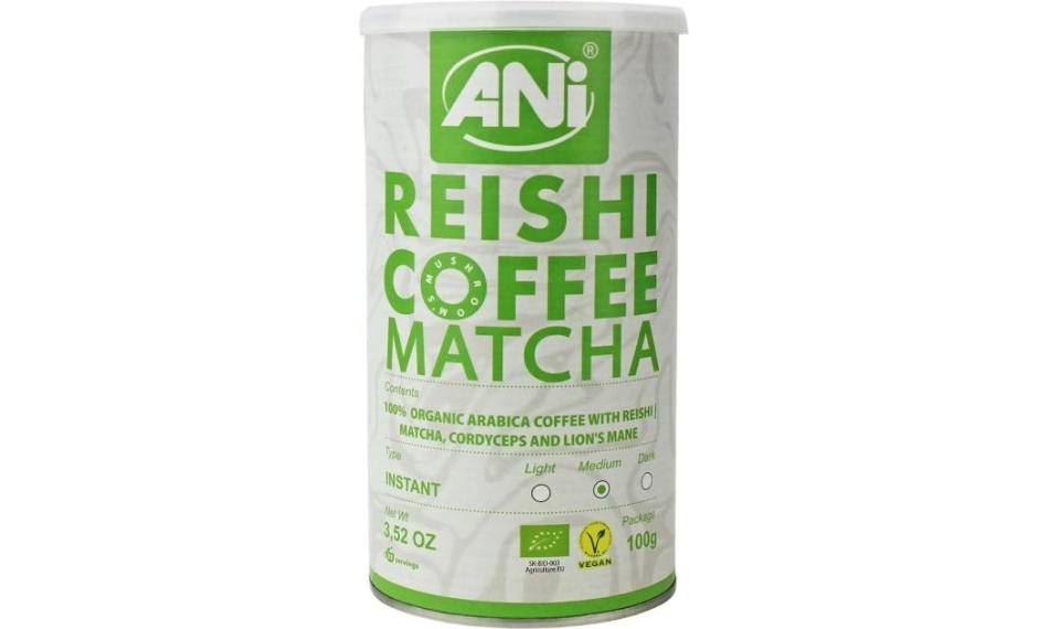 Suplement diety. Kawa arabica z herbatą matcha, ekstraktem z grzybów: reishi (lakownica żółtawa), maczużnik chiński (cordyceps), lion's mane (soplówka jeżowata).