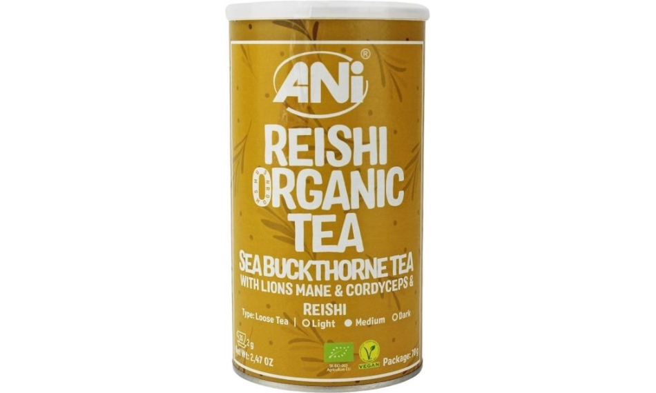 Suplement diety. Herbatka na bazie owocu rokitnika ze sproszkowanymi grzybami: lakownica żółtawa (reishi), soplówka jeżowata (lion’s mane), maczużnik chiński (cordyceps).
