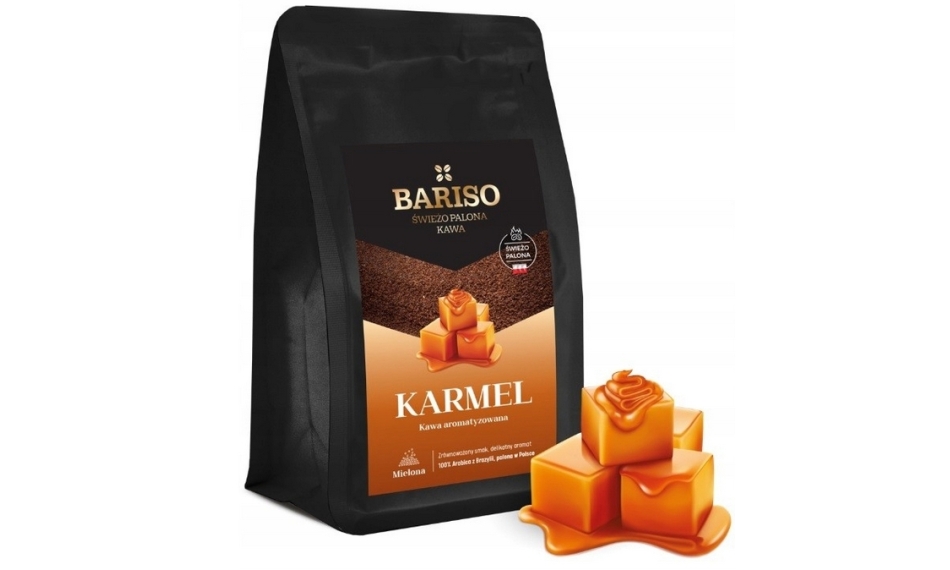 Kawa mielona BARISO KARMEL 200g to jasno świeżo palona mieszanka dwóch różnych kaw pochodzących z Brazylii; 100% Arabica na której smak składają się szlachetne ziarna odmian Yellow Bourbon oraz klasyczny Santos. Wyczuwalne nuty smakowe to oryginalny smak karmelu uzyskany poprzez dodanie naturalnego aromatu. Kawa o niskiej kwasowości, delikatna w smaku.