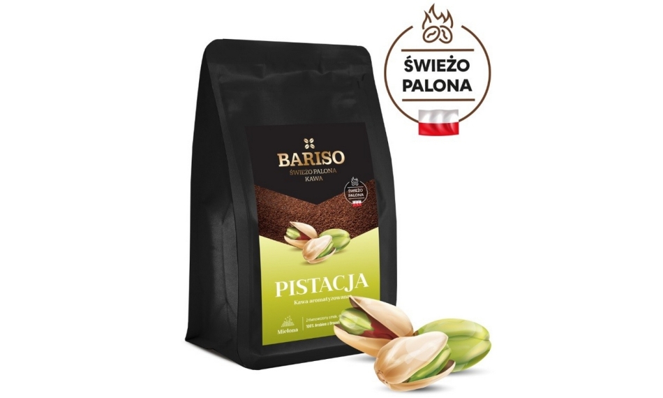 Kawa mielona BARISO PISTACJA 200g to jasno świeżo palona mieszanka dwóch różnych kaw pochodzących z Brazylii; 100% Arabica na której smak składają się szlachetne ziarna odmian Yellow Bourbon oraz klasyczny Santos. Wyczuwalne nuty smakowe to oryginalny smak pistacji uzyskany poprzez dodanie naturalnego aromatu. Kawa o niskiej kwasowości, delikatna w smaku.
