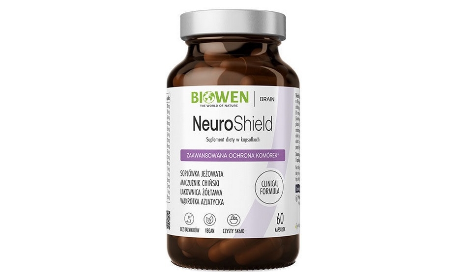 NeuroShield Biowen to zaawansowany suplement diety stworzony z myślą o osobach, które chcą wspierać zdrowie mózgu, pamięć, koncentrację i naturalne procesy regeneracji układu nerwowego. Łączy w sobie soplówkę jeżowatą Lion’s Mane, maczużnika chińskiego, lakownicę żółtawą Reishi, wąkrotkę azjatycką Centellin®, ekstrakt z oliwek Mediteanox® oraz piperynę BioPerine®. Synergia tych standaryzowanych składników wspiera produkcję czynników wzrostu mózgu (NGF i BDNF), chroni komórki nerwowe przed stresem oksydacyjnym i pomaga utrzymać prawidłową równowagę energetyczną. To doskonały wybór dla osób pracujących umysłowo, narażonych na stres, uczących się, a także wszystkich, którzy chcą wspierać długoterminową sprawność mózgu, pamięć i koncentrację.