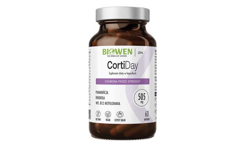 CortiDay Biowen to suplement diety stworzony z myślą o osobach, które chcą redukować stres i wspierać równowagę kortyzolu. Łączy w sobie ekstrakt z pomarańczy chińskiej Serenzo™, różeniec górski, zieloną herbatę, amlę Saberry®, a także witaminę B3, metylowaną i hydroksylową formę witaminy B12 oraz selen SeleniumSeLECT®. Synergia tych składników działa uspokajająco, a jednocześnie dodaje energii i poprawia koncentrację. To doskonały wybór dla osób zapracowanych, narażonych na przewlekły stres, rodziców w biegu oraz wszystkich, którzy chcą przejść przez dzień spokojniej i z większą energią.