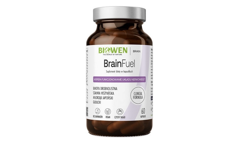 BrainFuel Biowen to suplement diety stworzony z myślą o osobach, które chcą wspierać pamięć, koncentrację i naturalną energię dla mózgu. W szybkim tempie życia — pełnym obowiązków, stresu i rozpraszaczy — wiele osób doświadcza spadku koncentracji, trudności z zapamiętywaniem czy tzw. „mgły mózgowej”, dlatego BrainFuel powstał, aby wspierać codzienną sprawność umysłową. Zawiera Bacopin™, Tinofolin®, Ginkgo biloba, Cognivia™ oraz witaminy z grupy B, które wspierają procesy poznawcze, krążenie mózgowe i odporność psychiczną. To doskonały wybór dla osób pracujących umysłowo, uczących się, żyjących dynamicznie oraz wszystkich, którzy chcą poprawić jasność myślenia i efektywność intelektualną każdego dnia.