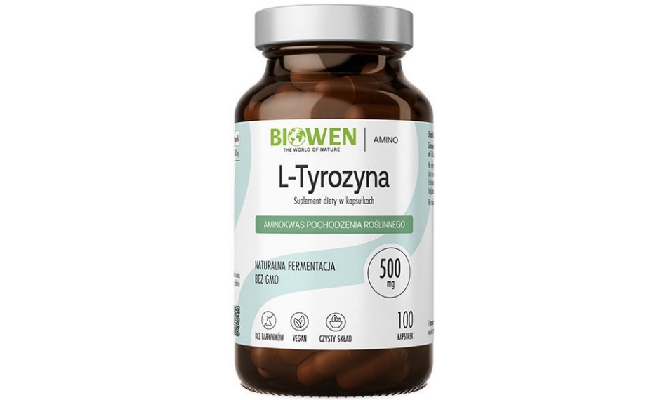 L-Tyrozyna Biowen to wegański suplement diety zawierający 500 mg czystego aminokwasu w każdej kapsułce. Produkt pochodzi z naturalnej fermentacji roślinnej, bez GMO.