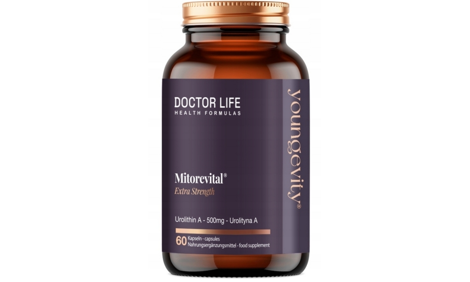 Wspiera proces mitofagii - samooczyszczania dysfunkcyjnych mitochondrów. Preparat linii longevity - odmłodzenie komórkowe. Rewitalizacja Mitochondriów i Odbudowa Mięśni, Wzrost energii komórkowej, Spowalnienie procesów starzenie.
