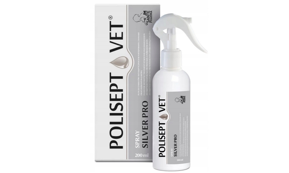POLISEPT VET® SPRAY SILVER PRO to specjalistyczny preparat antyseptyczny w formie izotonicznego płynu z nanokoloidem srebra, przeznaczony do przemywania ran i uszkodzonej skóry u psów i kotów. Większa butelka 200 ml sprawia, że jest to idealne rozwiązanie do regularnego stosowania w warunkach domowych, jak i w gabinetach weterynaryjnych. Preparat wykazuje silne działanie przeciwbakteryjne, przeciwzapalne i przeciwbólowe, a jednocześnie jest bardzo dobrze tolerowany przez tkanki. Dzięki wygodnej formie sprayu skutecznie oczyszcza nawet zainfekowane rany i wspiera ich gojenie.