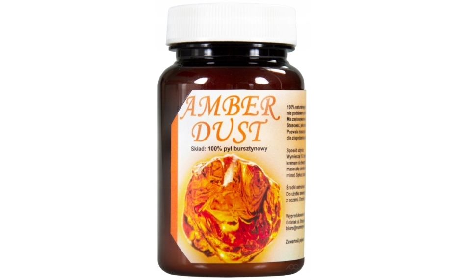 Piękno, zdrowie i uroda prosto z głębi natury 100% naturalnego, selekcjonowanego bursztynu bałtyckiego Nie poddawany obróbce chemicznej Pozwala złuszczyć naskórek Zalecany dla złagodzenia cellulitu 100% bałtyckiego bursztynu-sukcynitu, mielonego na zimno, dzięki temu bursztyn nie traci swoich właściwości. 20g w postaci pudru (pyłu). Może służyć, jako dodatek do Twoich kremów, olejku do masażu, szamponu lub mydła w płynie. Skuteczny peeling.