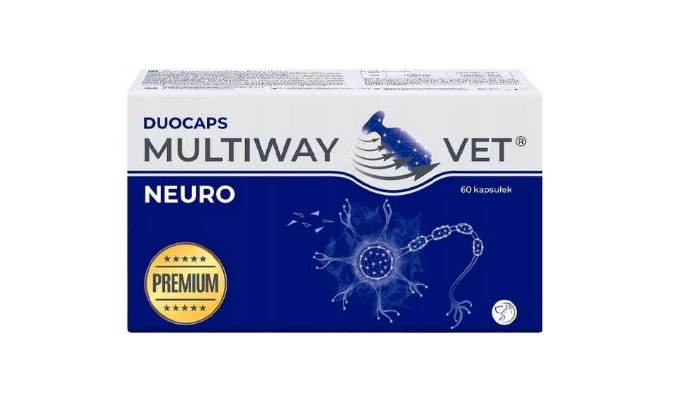 MULTIWAY VET® DUOCAPS NEURO to specjalistyczny preparat weterynaryjny w formie wygodnych kapsułek twist-off, przeznaczony do pomocniczego stosowania u psów i kotów z problemami neurologicznymi. Dzięki unikalnemu połączeniu składników aktywnych wspomaga funkcjonowanie układu nerwowego, spowalnia procesy degeneracyjne, poprawia ukrwienie mózgu i chroni neurony przed uszkodzeniem. Preparat znajduje zastosowanie zarówno u zwierząt starszych, jak i w przebiegu chorób nabytych czy wrodzonych.