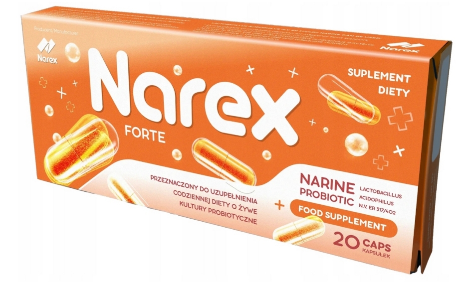Narex Forte to suplement diety w kapsułkach, zawierający wysoką dawkę żywych kultur bakterii Narine (Lactobacillus acidophilus n.v. Er 317/402). Czysta formuła oparta wyłącznie na Narine. Dzięki niemal podwójnej zawartości bakterii w porównaniu do standardowych preparatów, zapewnia intensywne wsparcie dla mikroflory jelitowej. Polecany w sytuacjach wymagających silniejszego działania probiotycznego – podczas antybiotykoterapii, przy zaburzeniach trawiennych i osłabionej odporności. Skoncentrowana formuła. Maksymalna skuteczność.
