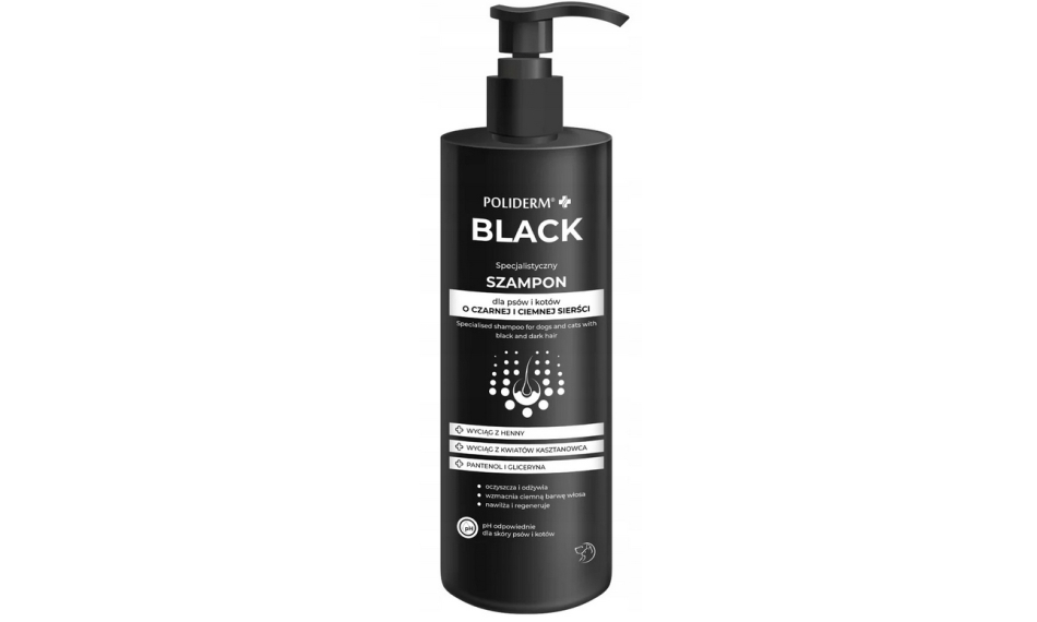 POLIDERM® BLACK wzmacnia ciemną barwę sierści oraz sprawia, że jest ona jedwabista i lśniąca, zmniejsza jednocześnie jej elektryzowanie się, ma też działanie przeciwzapalne.