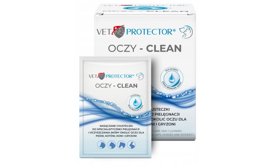 VET PROTECTOR® OCZY – CLEAN to specjalistyczne chusteczki nasączane aktywną formułą, przeznaczone do codziennej higieny i oczyszczania skóry w okolicy oczu psów i kotów. Pomagają usuwać zanieczyszczenia oraz wydzielinę, redukują zacieki łzowe i wspierają regenerację delikatnej skóry powiek. Dzięki neutralnemu pH oraz zamkniętej formie saszetek, każda chusteczka zachowuje sterylność i skuteczność działania, a pielęgnacja jest bezpieczna i komfortowa. Chusteczki zostały zaprojektowane tak, aby codzienna pielęgnacja była prosta i bezpieczna: skutecznie usuwają wydzielinę, zanieczyszczenia i zacieki łzowe, łagodzą podrażnienia i stany zapalne skóry wokół oczu, neutralne pH chroni wrażliwą skórę pupila, każda chusteczka jest sterylna – zapakowana osobno w zamkniętej saszetce, działają przeciwzapalnie, antyoksydacyjnie i nawilżająco.