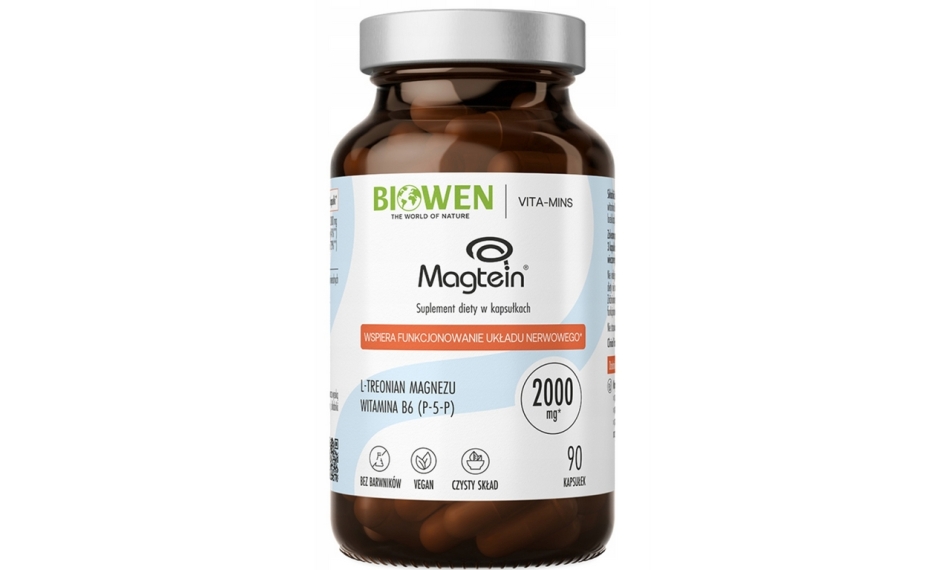 Treonian magnezu Magtein® Biowen to suplement diety opracowany z myślą o osobach, które chcą świadomie wspierać funkcjonowanie układu nerwowego, koncentrację i codzienną równowagę psychofizyczną. Formuła łączy opatentowaną formę magnezu Magtein® z aktywną witaminą B6 (P-5-P), tworząc kompleks wpisujący się w nowoczesne podejście do suplementacji.