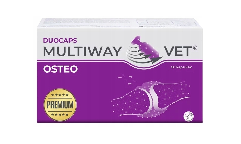 MULTIWAY VET® DUOCAPS OSTEO to specjalistyczny preparat w formie wygodnych kapsułek twist-off, stworzony z myślą o zwierzętach cierpiących na problemy ze stawami oraz jako profilaktyka chorób układu ruchu. Regularne stosowanie łagodzi objawy dyskomfortu, zmniejsza odczuwanie bólu, wspiera regenerację tkanki chrzęstnej i zwiększa zakres ruchu. Preparat poprawia mobilność i aktywność fizyczną pupila, pozwalając mu cieszyć się lepszą jakością życia. Wsparcie regeneracji chrząstki stawowej Zmniejszenie bólu i sztywności stawów Poprawa mobilności i komfortu poruszania się