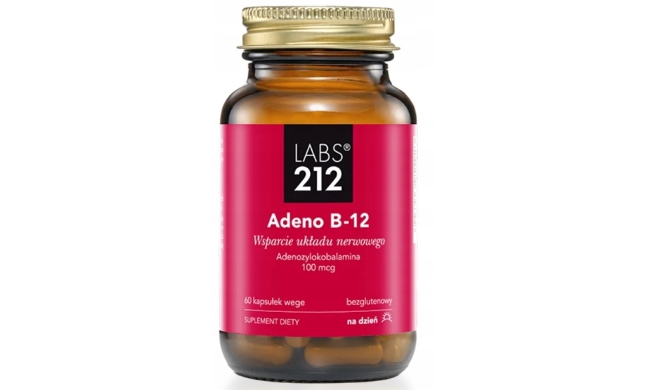 Suplement diety Adeno B-12 to preparat w postaci kapsułki zawierający witaminę B12 w formie adenozylokobalaminy.