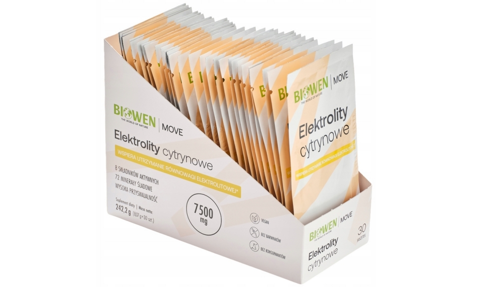Elektrolity Cytrynowe Biowen to suplement diety w wygodnych saszetkach, stworzony z myślą o szybkim i praktycznym uzupełnianiu elektrolitów w codziennych sytuacjach wymagających nawodnienia i wsparcia mineralnego. Formuła łączy kluczowe minerały – magnez, potas, wapń i sód – z dodatkowymi składnikami, takimi jak kreatyna, D-ryboza i acetylo-L-karnityna, tworząc kompleks przeznaczony dla osób aktywnych fizycznie i zawodowo.