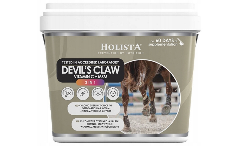 Holista Equine Devil's Claw 3 in 1 to synergiczna formuła, stworzona z myślą o koniach i kucach zmagających się z chroniczną dysfunkcją w obrębie układu kostno-stawowego. Ten preparat łączy trzy kluczowe składniki, które mają za zadanie poprawić komfort ruchu, wesprzeć elastyczność stawów i kondycję mięśni.