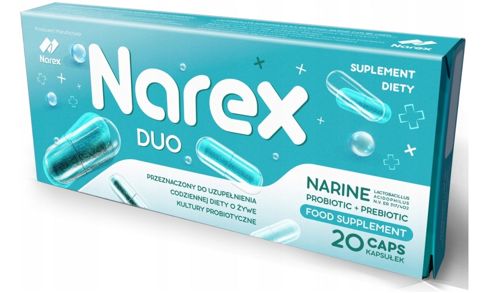 Narex Duo z inuliną to suplement diety w kapsułkach, który łączy unikalny probiotyk Narine (Lactobacillus acidophilus n.v. Er 317/402) z naturalnym prebiotykiem – inuliną. Taka synergia wspiera równowagę mikroflory jelitowej, poprawia trawienie i wzmacnia odporność. Inulina tworzy korzystne środowisko dla bakterii Narine – dzięki niej szybciej się namnażają i dłużej utrzymują w jelitach, co zwiększa skuteczność działania probiotyku. Idealny do codziennego stosowania i w sytuacjach zaburzeń pracy układu pokarmowego.