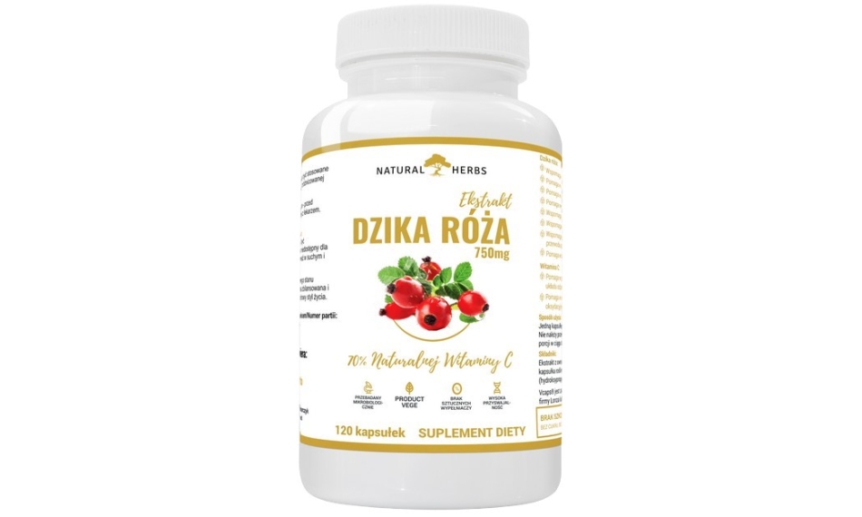 Ekstrakt z owoców dzikiej róży (Rosa canina), kapsułka roślinna Vcaps (hydroksypropylometyloceluloza - składnik otoczki).