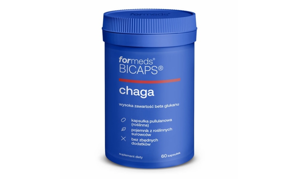 BICAPS chaga to ekstrakt z grzyba chaga (błyskoporek podkorowy), standaryzowany na wysoką zawartość składnika aktywnego - beta glukanu. Linia BICAPS to suplementy diety bez zbędnych dodatków zamknięte w pullulanowej kapsułce roślinnej.