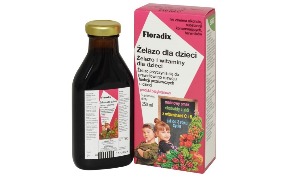 Floradix, Żelazo dla dzieci – suplement diety zawierający żelazo, witaminę C i witaminy z grupy B. Produkt przeznaczony dla dzieci od 3. roku życia, młodzieży i dorosłych. Bez glutenu, laktozy, alkoholu, substancji konserwujących i barwników. Odpowiedni dla wegetarian i wegan. Smak malinowy.