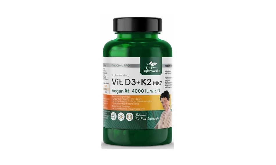 Witamina D3 + K2 Wegańska to suplement diety rekomendowany przez dr Ewę Dąbrowską. To kapsułki stworzone z myślą o osobach na diecie wegańskiej i wegetariańskiej. Witamina K2 MK7 jest niezbędna dla prawidłowego przyswajania wit. D3. Witamina D wpływa bowiem na zwiększenie przyswajania wapnia z przewodu pokarmowego, a witamina K2 MK7 kieruje go do tkanki kostnej, zapobiegając wapnieniu naczyń krwionośnych i wzmacniając strukturę kości.