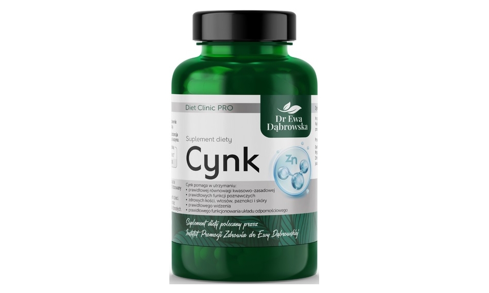 Cynk Dr Ewa Dąbrowska to preparat z wysokoprzyswajalnym diglicynianem cynku. Pierwiastek ten jest potrzebny do prawidłowej pracy mózgu – do koncentracji i zapamiętywania. Pierwiastek dostarczany w odpowiednich ilościach zapewnia gęste, lśniące włosy i mocne paznokcie. Skóra w efekcie jest elastyczna i gładka. Dzięki właściwościom przeciwzapalnym cynku – zmniejsza się trądzik i znikają nieestetyczne zaczerwienienia.