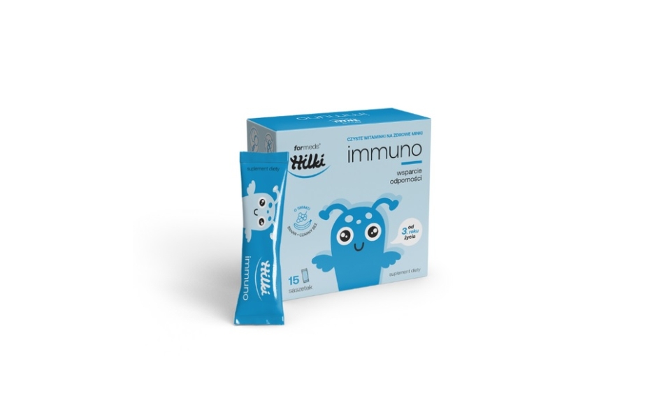 HILKI immuno to suplement diety w postaci wygodnych saszetek z proszkiem, przeznaczony dla dzieci w wieku 3+. Zawiera połączenie 5 immunostymulujących składników aktywnych: witaminę C z aceroli, sok z owoców czarnego bzu, beta glukan z alg, rutynę z perełkowca japońskiego i cynk.